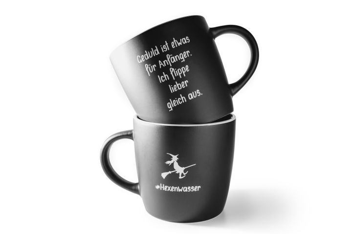 Schöne Erinnerungen aus demHexenwasser: Von den Hexentafeln im Hexenwasser auf die Tasse bis zu Dir nach Haus - Ein Hexenspruch ziert die Vorderseite der schwarzen Tasse, auf der Rückseite fliegt die Hexe auf ihrem Besen - wähle aus, welcher Spruch am Besten zu Dir passt!